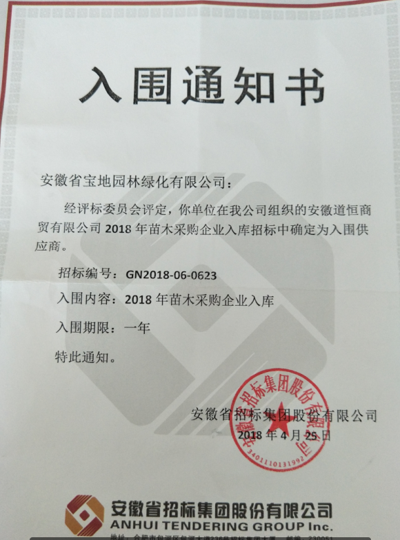 热烈庆祝我公司中标“安徽道恒商贸有限公司2018年苗木采购企业入库”入围,我公司将再接再厉!再创辉煌!!!!