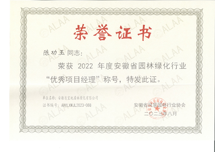 祝贺:安徽省宝地园林绿化有限公司(陈功玉)被评定优秀项目经理